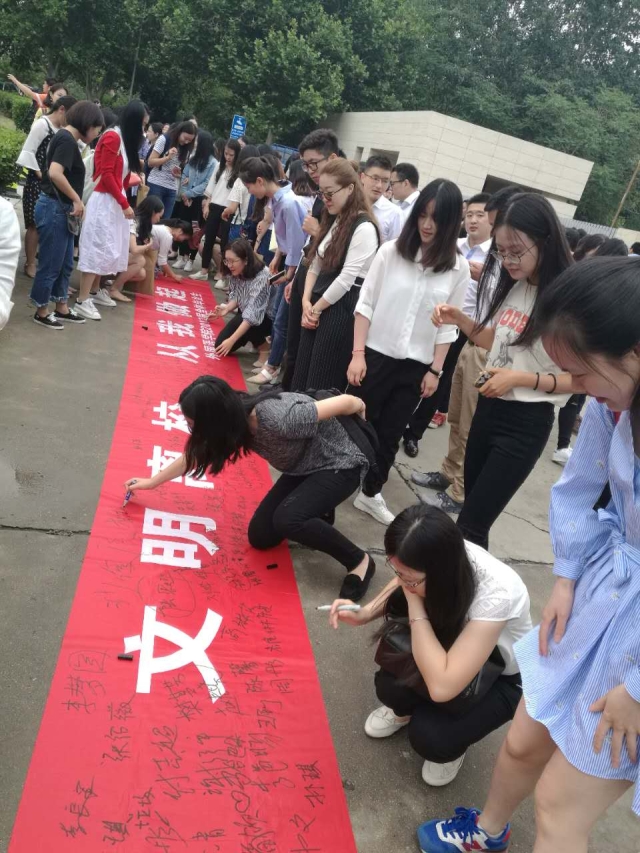 为表示毕业生安全文明离校的决心,强化文明安全毕业意识,将毕业安全牢记心头,伟德APP下载地址于近日进行了文明安全离校签名活动,全体本科和研究生毕业生在条幅上郑重地签下了自己的名字,该条幅将悬挂在伟德APP下载地址教学楼门前,时刻提醒伟德APP下载地址毕业生强化安全意识,做好安全文明离校工作。