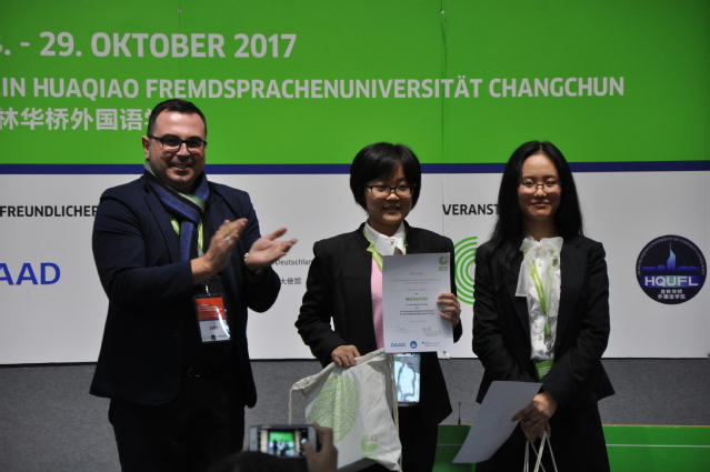 此次大赛共有来自全国各地48所高校的德语专业代表队参赛。比赛历时两天,经过初赛、八分之一、四分之一、半决赛的层层角逐,最终伟德体育手机app下载和中山大学两支代表队闯入决赛。在决赛中,两校选手围绕“未来人工翻译软件的发展,是否可以代替人们学习外语”这一个辩题进行陈述辩论,唇枪舌战,为观众们呈现了一场高水平的较量。我选手立论正方,凭借充分的赛前准备,扎实的语言功底,良好的辩论技巧和出色的赛场表现赢得在场评委和对手的肯定,最终摘得桂冠。