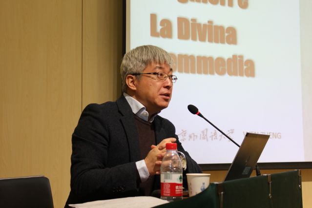 讲座伊始,文铮便指出意大利是个文化大国,并继而引申到文化素养对于语言人才的重要性、大学教育的要义和真谛,为介绍但丁及其著作《神曲》做铺垫。他引经据典,旁征博引,所举的例子涉猎古今中外,令人信服。“没有文化的语言是一个空壳”,而对中国、对象国乃至整个西方、整个世界有着充分了解的人才则具有更大的可塑性。他提到,西方“七艺”与中国古代的“六艺”均不能直接转化为生产力,但却是古代文人必须具备的素养。正如耶鲁大学前任校长Richard Charles Levin所言,“大学教育不教知识和技能,却能让人胜任任何学科和职业。”