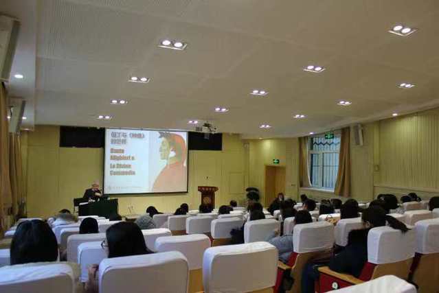接着,文铮讲述但丁及《神曲》在中国近代文坛的影响力。早在1868年,但丁的名字便出现在中国,梁启超、鲁迅、郭沫若等人的作品中均曾提及但丁。此外,但丁用托斯卡纳方言写作《神曲》促进意大利语诞生,这一壮举激励了胡适开展白话文运动。然而,他表示,中国现今对但丁的研究还相当浅,他对意大利语专业的学生从事但丁研究寄予了殷切期望。
