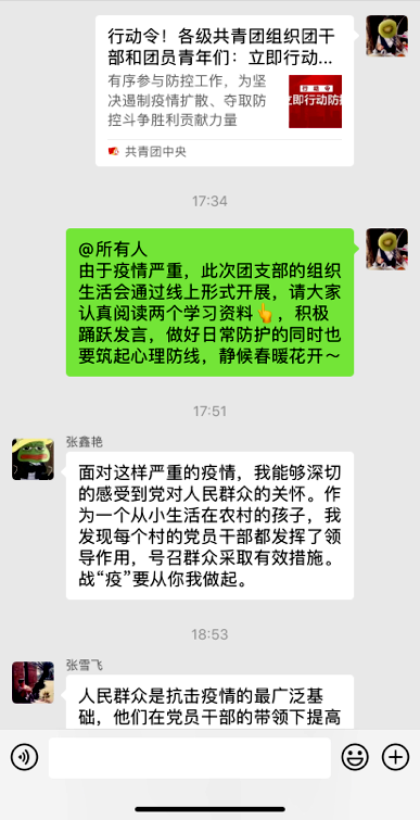 通过学习交流,团员们纷纷认识到防控疫情的重要性,表示不仅要重视自身的安全防护,更要以共青团员的身份时刻要求自己,通过力所能及的行动为人民群众做贡献,众志成城、共渡难关。