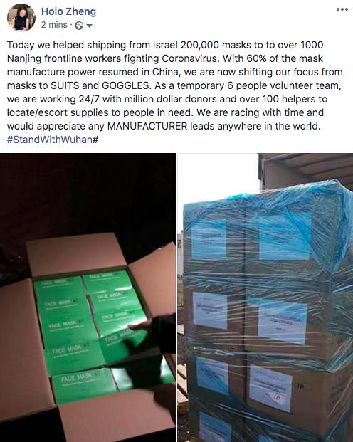 2月2日,志愿团队又采购了第二批医疗物资,从以色列发往南京200000只医用口罩,这些物资将会被发放到前线排查疫情人员手里。郑小星校友表示,国内口罩生产能力目前已经恢复六成,我们将把寻购物资重点从口罩转到防护面具和防护服。我们的临时志愿团队由六人组成,全天候地与各地捐助人及志愿者合作,将物资送到有需要的人手中。