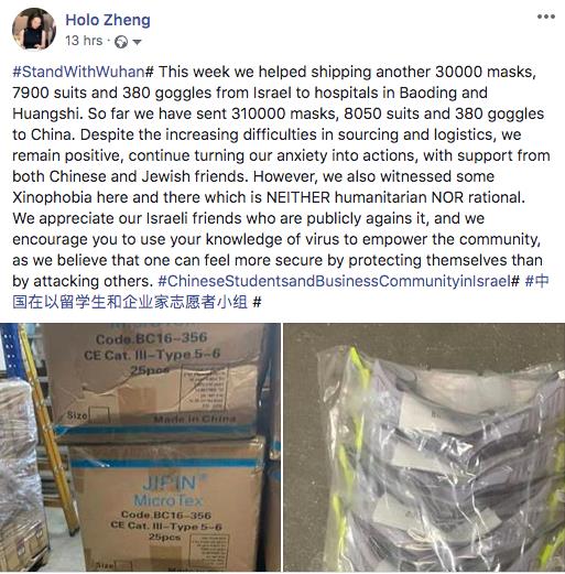 2月11日,郑小星志愿团队第三次从以色列向国内发货,向河北省保定市和湖北省黄石市的医院发送了30000只口罩、7900套防护服和380副防护面罩。郑校友表示,尽管物资采购和物流变得愈发困难,但在华人和犹太朋友的共同支持下,我们依然保持乐观精神,将焦虑转化为实实在在的行动。