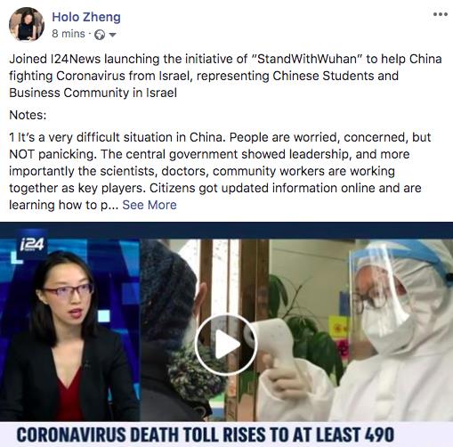 2月7日,郑小星校友接受了以色列I24News新闻频道的采访,介绍了“与武汉同在”志愿团队以实际行动支援祖国抗击新型冠状病毒的情况。