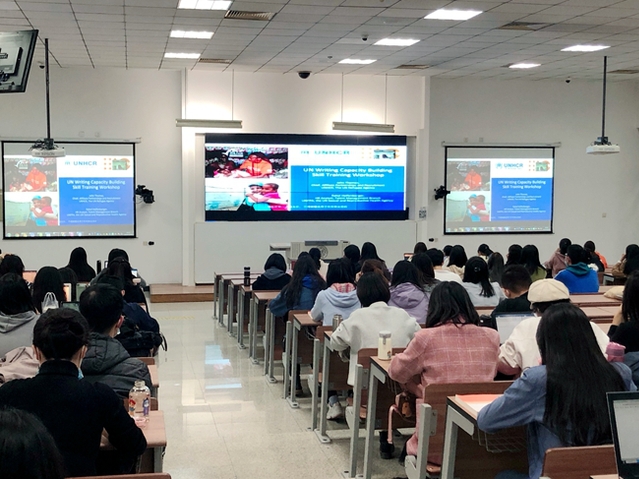 开幕式后,同学们共同观看了第二届联合国机构宣讲咨询公开课。在公开课上,联合国难民署与红十字国际委员会等国际组织代表分别就岗位介绍、核心能力、简历写作等方面进行了说明,并对面试技巧进行了分享。