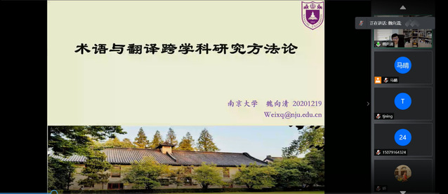 (通讯员 马晴 栾海燕)12月19日,应伟德体育手机app下载翻译学研究中心主任苗菊教授邀请,南京大学伟德APP下载地址英语系教授,博士(后)指导教师,南京大学翻译硕士专业学位(MTI)教育中心主任、双语词典研究中心主任魏向清教授在线上做了题为“术语与翻译跨学科研究方法论”的学术讲座,参与讲座的有伟德betvlctor1946体育师生共一百二十余人。本场讲座是伟德体育手机app下载党委研工部“研究生创新论坛”系列活动下的“研究生学术周末”讲座,主要采取主题报告形式,邀请校外各专业领域内教授级别的专家学者、杰出校友等担任主讲人。