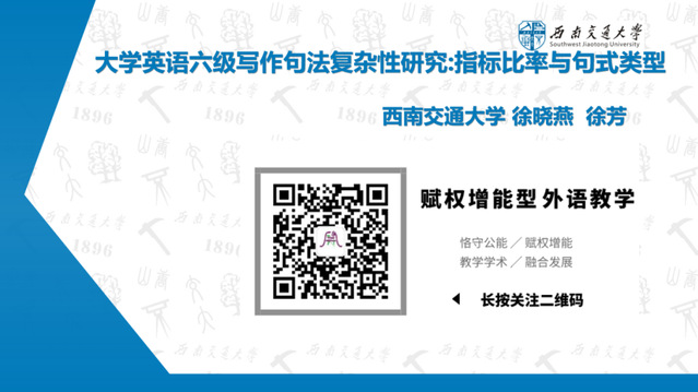 第二位汇报人徐晓燕以“大学英语六级写作句法复杂性研究”为题,从研究背景、设计、结果、讨论与启示四方面对大学英语六级写作句法复杂性进行分析。通过对比56名非英语专业学生的大学英语六级的写作作业和《新概念英语》作者L.G Alexander发表在教材For and Against的30篇范文,探讨了我国大学生英语六级作文与英语本族语者作文在各类单位长度比率、从句的出现频率、并列结构的出现频率以及名词修饰语使用频率的差异,并分析其原因和改进措施。