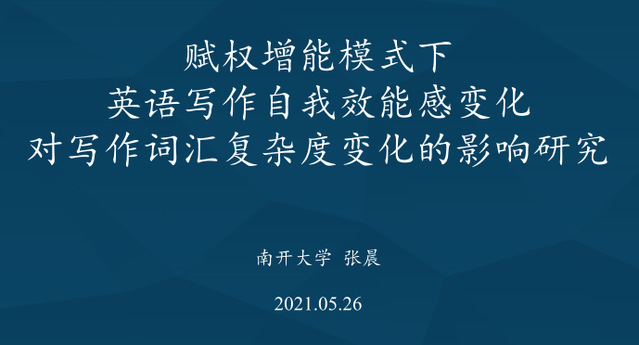 张晨以“赋权增能模式下英语写作自我效能感变化对写作词汇复杂度变化的影响研究”为题,从概述及文献回顾、研究方法、数据分析及结果、讨论与启示四个方面简要汇报了她应用“赋权增能理路”引领下的“做学用合一”自运行课堂模式进行英语专业二年级写作教学而展开的纵向定量研究。她的研究表明,对学生充分赋权有助于学生心理增能和语言产出增能。
