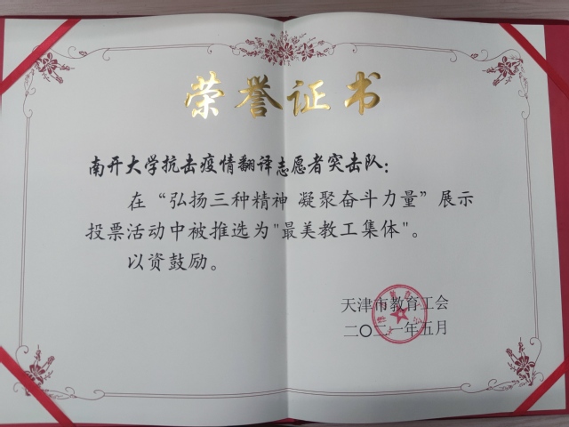 近日,天津市教育工会开展了“弘扬三种精神,凝聚奋斗力量”线上展示投票活动,学校工会推荐伟德APP下载地址抗击疫情翻译志愿者突击队参评,获天津市“最美教工集体”荣誉称号。伟德APP下载地址工会拍摄录制了具有鲜活表现力和感染力的参评视频,视频展示了我校伟德APP下载地址抗击疫情翻译志愿者突击队,在天津市成为国际客运航班指定入境点后,在境外输入趋势愈加严峻的时刻,不畏艰险,主动请缨,以语为甲,投身机场抗疫一线,身披防护服,守卫国门,完成入境检查、问询核对、流行病学调查和入境集中隔离的沟通协调等一系列工作的感人事迹。视频在全市范围内公开展示投票,向全社会展现了南开人把小我融入大我、接续奋斗、矢志报国的赤诚情怀。