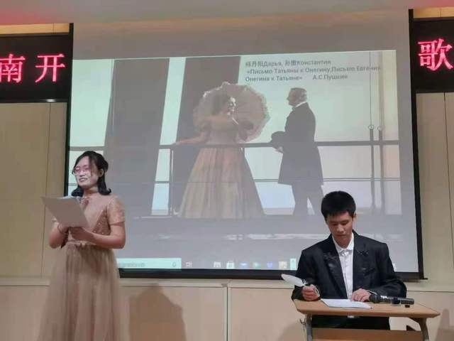 经过激烈的角逐,俄语系2020级学生师丹阳、孙傲荣获一等奖。他们两人合作朗诵《塔季扬娜写给奥涅金的信,奥涅金写给塔季扬娜的信》选自普希金的著名诗体长篇小说《叶甫盖尼·奥涅金》,将戏剧表演与诗歌朗诵两种艺术形式进行了完美结合,别出心裁。他们使用桌椅、纸笔等道具,还原写信场景,并将原本处于两条时空线的两封信件进行穿插演绎,语速自然流畅,情感真挚动人,震撼了在场观众。