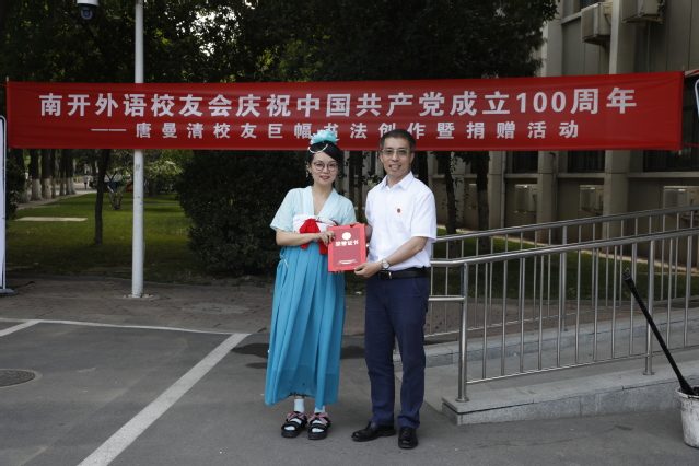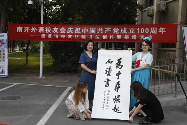 (南开外语校友会秘书处)为庆祝中国共产党成立100周年,喜迎建党百年华诞,南开外语校友会于6月22日下午举办了巨幅书法创作暨捐赠活动。