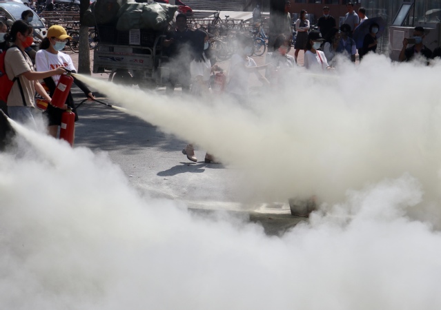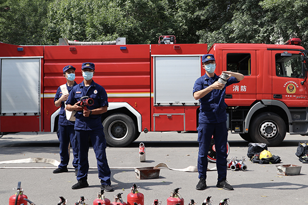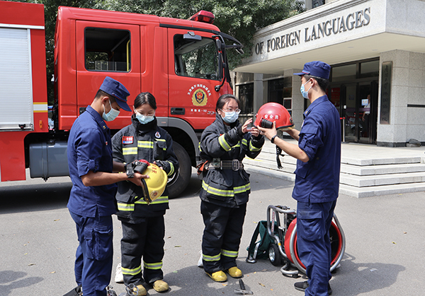 演练开始前,南开消防支队防火监督科宣讲文员卢力萌为大家讲解了校园火灾隐患问题和消防安全知识。活动正式开始后,南开消防支队防火监督科监督员孙金浩、南开区消防救援支队灵隐道站副站长赵子霖长结合具体案例,向大家详细讲解逃生疏散知识,介绍了常用消防设备和特种消防装备的使用方法,包括灭火器、消防水枪、消防面具、防护服、氧气瓶等消防器材,并进行了具体演示。在消防队员的指导下,两名新生代表尝试了消防服、呼吸设备和消防工具,进行了一次“消防员”体验。随后,消防指战员组织师生进行了灭火器扑灭初期火灾实操练习。现场气氛热烈,在场师生都深刻感受到了消防安全的重要性。