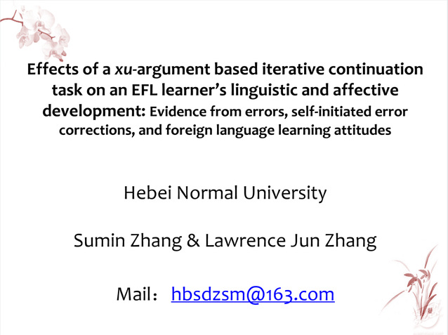 张素敏的汇报题目为“Effects of a xu-argument based iterative continuation task on an EFL learner’s linguistic and affective development: Evidence from errors, self-initiated error corrections, and foreign language learning attitude”。张老师从对“哪种类型的教学能够激发错误修正?自发性错误修正与学习态度有何种关系?”等问题的思考中,提出假设并设计实验收集数据,研究发现基于续论的多轮续写任务互动强度大、协同效应强,促使学生在写作中主动发现错误,不断自我修正,且对学生的学习态度和学业成绩产生一定的积极影响。