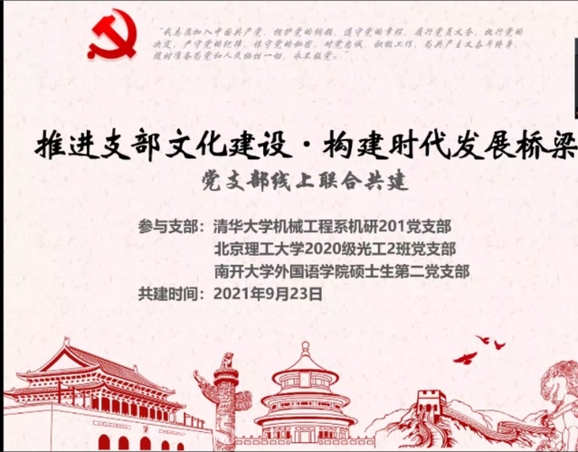 南开新闻网讯(通讯员 李鹤彤 周文钰)近日,伟德betvlctor1946体育硕士生第二党支部联合清华大学机械工程系机研201党支部、北京理工大学2020级光工2班党支部开展“推进支部文化建设,构建时代发展桥梁”支部共建主题党日活动。活动邀请清华大学机械工程系研工组李卓恒老师和北京理工大学光电学院党建辅导员黄颖老师作为主题讲授嘉宾,三校支部党员共同交流建设经验,取长补短,充实支部建设路径和方法,共120余人参与了本次活动,