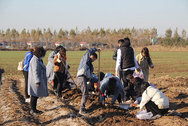 活动伊始,基地工作人员介绍了耧、耙、犁等农业用具的用途和使用方法,并带领同学们了参观耕地,识别并学习各种农作物种植要领。同时,大家也了解了在南泥湾大生产运动时期,革命先辈们正是靠着这些简陋的农具屯田开荒,自己动手、丰衣足食,将革命的火种越燃越旺。接下来,工作人员组织同学们采摘农作物,如胡萝卜、红薯等,大家抡起锄头,干劲十足,男同学们负责挖土,女同学们负责捡拾作物,互相配合,默契十足。