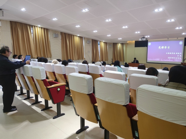 党课分线上线下同时举行。来自学院硕士生第三党支部、日语系本科生2019级党支部学生党员在报告厅参加党课学习活动。全员退休教师党员通过腾讯会议参加活动。