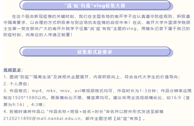 此外,党支部举办了“战‘疫’有我”vlog征集大赛,面向学院全体学生,征集主题为“抗疫”、“防疫”有关的vlog,并鼓励支部党员投入到各项疫情志愿服务工作中,并用镜头记录下全国各地的家乡风景,隔离房外的风景,以及隔离期间的思考,多形式助力全民战疫。