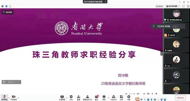 活动中,来自不同专业的2022届应届毕业生在“云端”分享了自己在过去的几个月中求职成功的一手经验,对各自的职业选择、信息搜集、求职历程、笔面经验等方面进行了详细介绍,也对同学们提出的各种问题进行解答,鼓励同学们抓住机遇,在防疫期间充实自己,定能在接下来的春招与招考中取得成功。获得深圳市在编教师offer的2020级英语口译徐帆分享了自己几个月以来的教招求职历程与笔面试的准备诀窍,鼓励同学们不惧失败,大胆尝试。考取了天津市选调生的2019级英语语言文学张鑫艳则和同学们分享了选岗窍门,结合真题讲述了自己的笔试备考过程与经验。