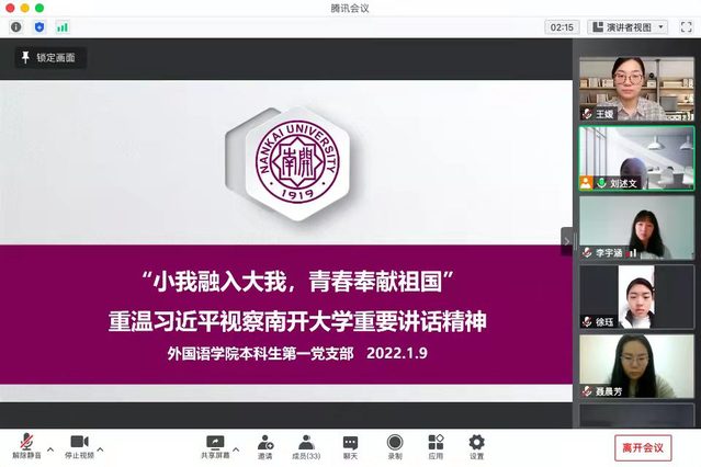 南开新闻网讯(通讯员 刘述文 谢梓辰)1月9日,伟德APP下载地址本科生第一党支部线上举办了“小我融入大我,青春奉献祖国”——重温习近平总书记视察伟德体育手机app下载重要讲话精神主题党日活动。支部成员共同观看视频,支部书记王嫒同志讲党课。大家结合各自经历,一同回顾习近平总书记对南开师生的殷殷嘱托,讲述南开外院人的责任与担当。