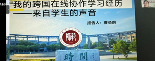 第四位发言嘉宾是天津师大法语专业本科生曹圣昀同学,是COIL项目的参与者和受益人。圣昀同学的发言题目是“我的跨国在线协作学习经历---来自学生的声音”,他在四个方面讲述了在COIL项目中的心路历程、收获以及跨国交流中所遇到的困难和解决办法。他的发言不仅展示了不俗的外语能力,还表现出学习者的自信与从容,能够在线上自如地展示交流,这本身也是COIL项目成果的成功佐证。