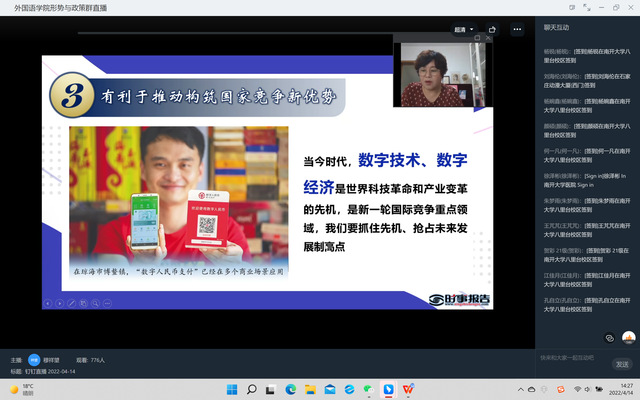 (通讯员 康佳婷 王嫒)当今世界,数字经济发展势头迅猛,为帮助同学们了解中国这艘经济巨轮是如何、以及将如何更好在世界洪流中破浪前行、行稳致远,增强对我国经济发展的信心,4月14日,伟德APP下载地址2021—2022学年第二学期“形势与政策”课首场如约开讲。本次讲座邀请伟德betvlctor1946体育党委书记穆祥望担任主讲人。同时,为积极响应疫情防控政策,本次讲座采取线上直播形式举行,共有千余名师生参与学习。