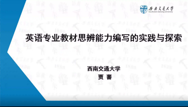 第二位主讲人为西南交通大学贾蕃副教授,汇报题目为“英语专业教材思辨能力编写的实践与探索”。贾蕃老师先是指出了目前思辨能力在教材编写中的困境与问题,接下来介绍了外语教材思辨能力的编写框架并展示了关于课本思辨内容的详细设计,包括思辨技能的确立、思辨情景化实现、思辨活动的设计以及在教材中的呈现,在本场汇报的末尾,贾老师总结了本次研究带来的启示。