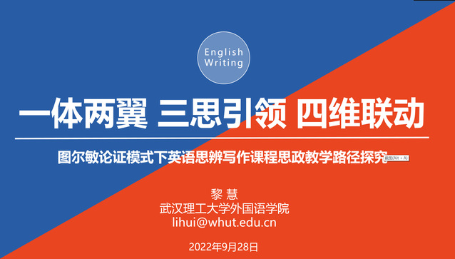 第二位主讲人黎慧教授的报告题目为“图尔敏论证模式下英语思辨写作课程思政教学路径探究”。黎教授依据学情分析和英语思辨写作教学中存在的痛点,探索并提出了“一体两翼、三思引领、四维联动”的教学理念,并基于此创新教学模式、教学过程和方法以及考评体系,切实解决了教学中的痛点,促进了课程建设和人才培养。黎教授提出将图尔敏论证模式引入“课程思政”元素学习中,既提升学生写作和思辨能力,又帮助学生树立积极健康的价值观。