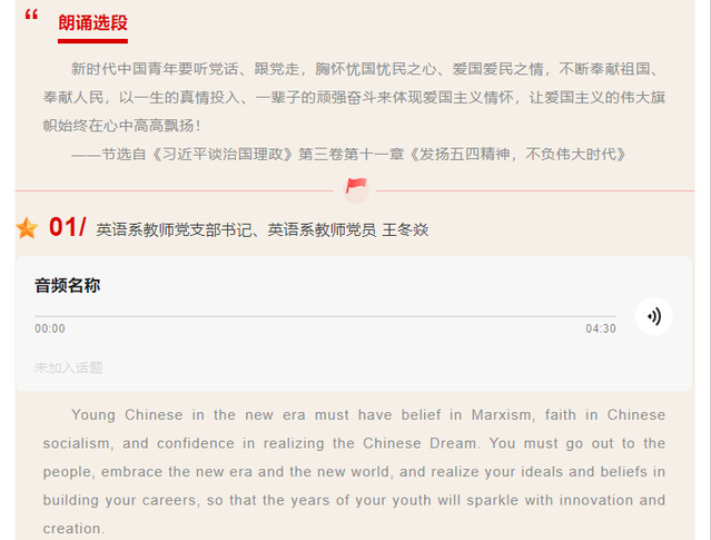 爱国主义是我们民族精神的核心。为弘扬伟德体育手机app下载爱国主义光荣传统,本次师生共读活动结合外语特色,学习习近平总书记关于弘扬爱国主义精神重要论述,旨在激发同学们的爱国热情,鼓励师生在聆听诵读的过程中凝聚起中华儿女团结奋斗的磅礴力量。