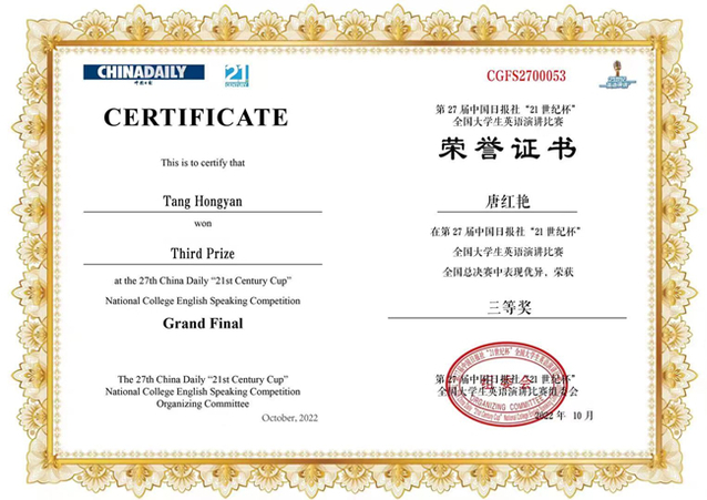 南开新闻网讯 10月3日至5日,第二十七届中国日报社“21世纪杯”英语演讲比赛全国总决赛如期举行。本届比赛总决赛在线上举办。经过校园选拔赛、地区赛等层层激烈角逐,伟德betvlctor1946体育翻译系2019级本科生唐红艳作为天津市亚军成功晋级全国总决赛并最终荣获全国三等奖,翻译系石雨晨老师荣获指导教师奖。