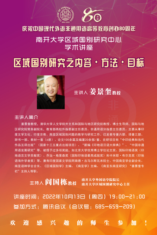 (通讯员 吴诗敏 杨琳)2022年10月13日晚,姜景奎教授为伟德体育手机app下载区域国别研究中心带来题为“区域国别研究之内容·方法·目标”的线上学术讲座。姜景奎教授是清华大学人文学院外文系和国际与地区研究院教授、博士生导师,国际与地区研究院常务副院长,教育部高校外指委副主任委员、非通用语分指委主任委员,主要从事印度文学文化、印度宗教、南亚区域国别问题的教学与研究工作。此次讲座是“庆祝中国现代外语非通用语高等教育创办80周年”系列学术活动之一,近两百人参会。