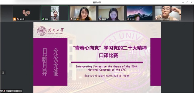 10月20日晚,2022级英语口译班团支部以线上腾讯会议的方式,成功举办了“学习二十大,青春心向党”主题知识口译竞赛。本次口译比赛紧紧围绕党的二十大报告展开,从专业外语学习视角出发,对报告认真研读,仔细分析报告英译所采取的翻译策略、方法、技巧。在比赛过程中,同学们聚精会神,以同声传译的方式口译报告相关内容,并在译后交流讨论、总结经验。本次班级竞赛活动得到了学院团委、英语系、公共英语教学部的大力支持,伟德APP下载地址副教授、硕士生导师郭嘉作为班导师出席此次会议并对同学们给予专业指导与建议。通过此次主题知识口译比赛,党的二十大精神进一步走进校园、走进班级,同时进一步增强了口译专业同学的英语专业理论与实践能力,为培养新时代南开外语人才增添动力。