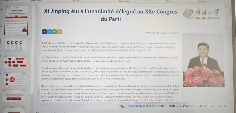 法语系在此次集体备课会中就党的二十大报告进课堂进行了交流。老师们重点研讨了党的二十大报告中古典引语的法语翻译,并一致认为在日常课堂的教学中和平时的生活工作中,应该把马克思主义思想精髓同中华优秀传统文化精华贯通起来、同人民群众日用而不觉的共同价值观念融通起来,不断赋予科学理论鲜明的中国特色,不断夯实马克思主义中国化时代化的历史基础和群众基础,让马克思主义在中国牢牢扎根。