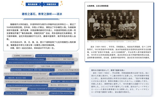 译制内容以六语对照的形式制作成7篇“集外院先锋故事,译外语模范风采”系列专栏推送在学院公众号上推出,带动更多外语专业学生提高语言翻译能力、了解南开外院底蕴;后期,支部还将把相应事迹及其翻译装订成册,摆放于外院一楼报刊存放处,利用多语种优势,向更多中外师生介绍外院历史沿革及杰出人物事迹。