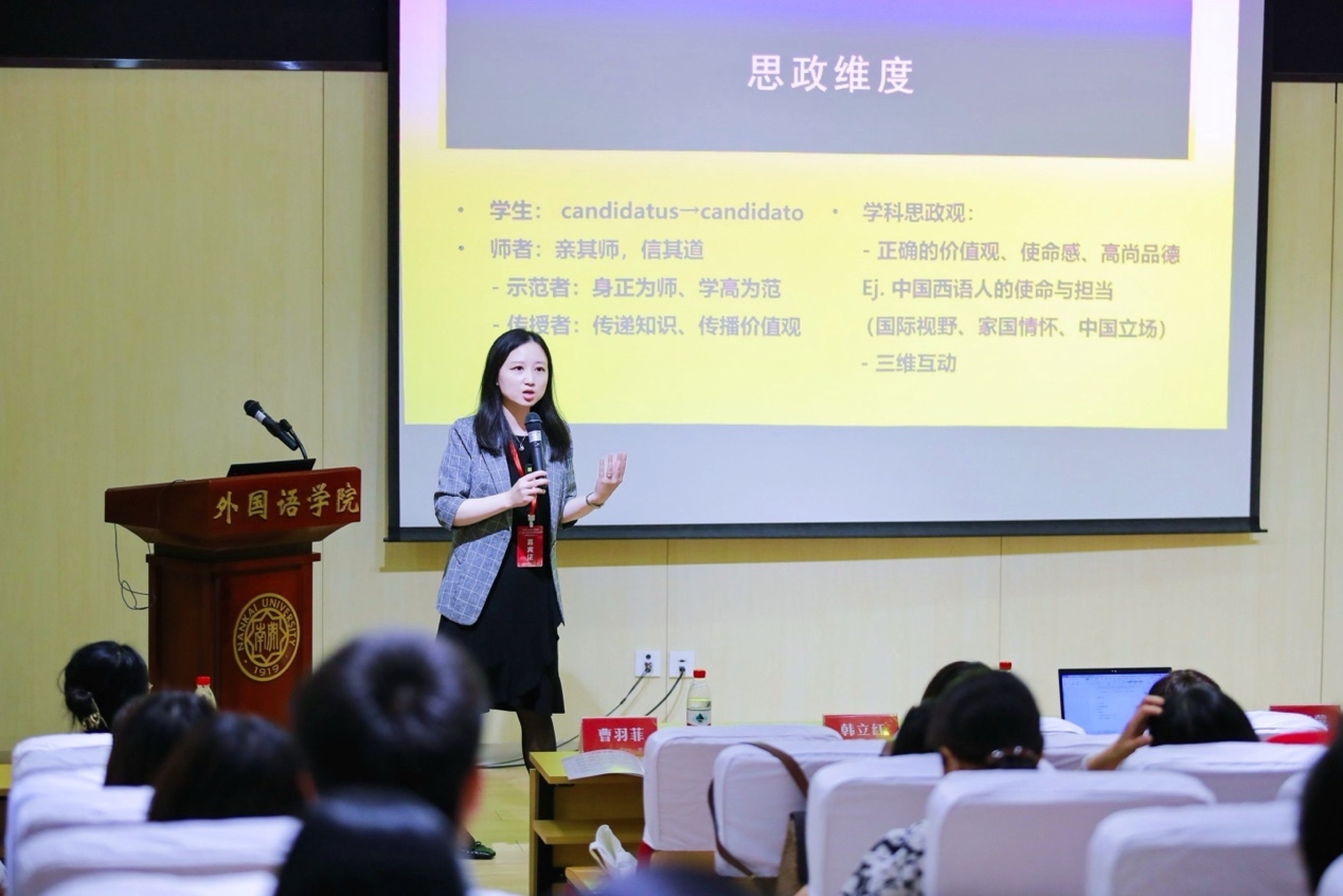 在下午场的专题报告中,北京外国语大学魏然副教授作了题为“以综合能力培养为核心的第二课堂体系构建”的报告,介绍了北京外国语大学在培养学生创新创业能力的特色做法,提出了思政引领、专业学习与实践开展有机结合的改革方向。上海外国语大学曹羽菲副教授在“新时代课程思政教学设计的新思路”的报告中,展现了思政生态观里的“见木又见林”的三维互动,对培养学生的使命与担当提出了新的倡议。伟德体育手机app下载杨琳副教授以“区域国别研究人才培养模式的探究与实践”为题,以意大利语为例,介绍了伟德体育手机app下载区域国别培养模式的成果。上海外语教育出版社多语营销部龙歆韵副总经理向与会代表介绍了外教社的教学资源和教学支持服务,并表示,外教社将一如既往与全国高校的多语种教师携手,共同建设普惠的、完整的、高质发展的教学教研新生态。