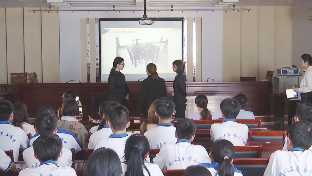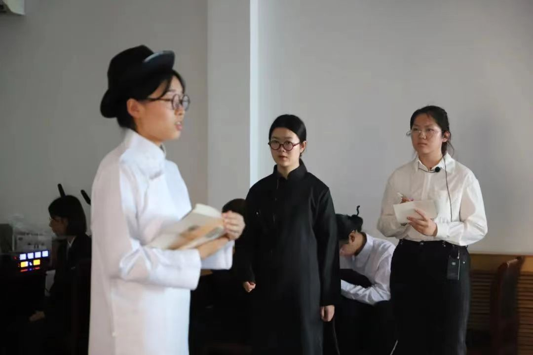 学习经验分享结束后,外文剧社同学们表演了以西南联大为主题的历史短剧,以南开先贤张伯苓、柳无忌、吴大猷等代表人物的视角展开叙事,带领大家一起回忆了那段惊心动魄却又热血激昂的联大岁月,展现了南开的红色基因,传播了南开百年校史文化,蕴含了“允公允能 日新月异”的南开校训精神。这一次的展演以外文戏剧的方式展开,兼具外院特色,在传播校史的同时,也更好地帮助大家了解南开、向往南开。展演受到了河间一中师生的热烈欢迎,也被当地媒体《河间周报》进行了专题报道。