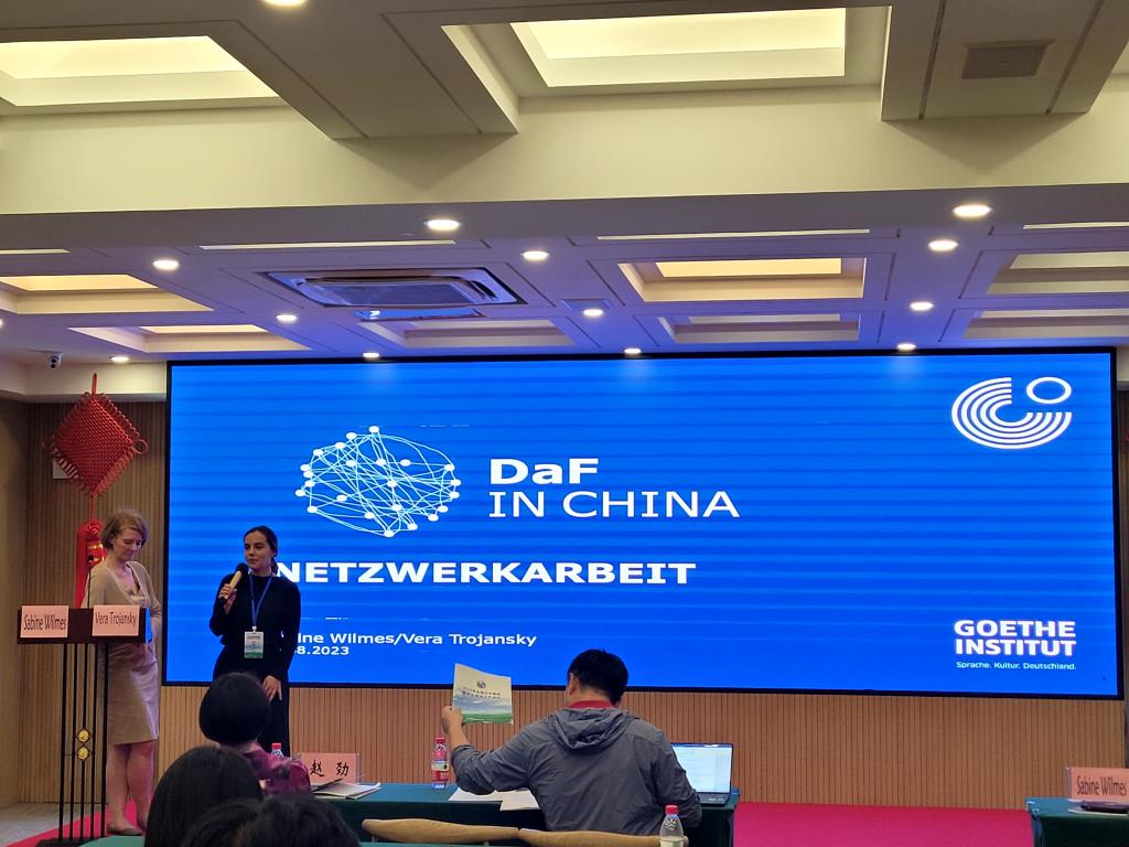 本次大会上,歌德学院(中国)和各出版社代表也向与会教师介绍了各自单位的工作情况。魏冰娜及德语教学合作处主任杨佳芝(Vera Trojansky)在回顾上一年工作和成果的基础上,介绍了歌德学院(中国)2023-2024年度的工作安排及其对德语教师线上、线下教学法培训重点。