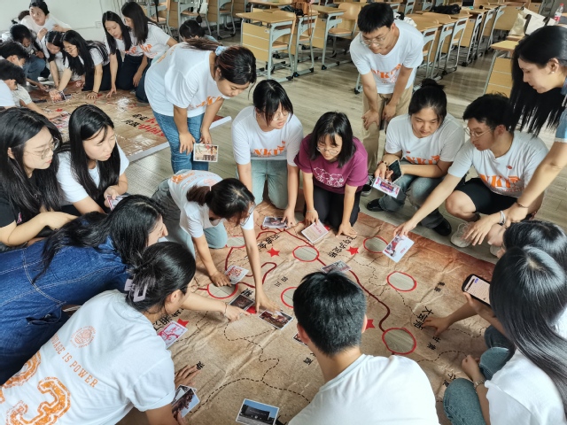 活动中“重走长征路”环节,新生党员合力操控小球躲避障碍,沿着“红军长征”路线前进并最终“抵达”延安,带领同学们回顾了红军长征的主要据点,领略了红军二万五千里长征的艰难困苦,激励同学们铭记党史,不忘初心;“党史知识你画我猜”环节,全体党员以小组为单位展开竞争,围绕“秋收起义”、“群众路线”等党史中重要的事件和术语,同学们通过绘画的方式更加直观具体地感知党的千秋伟业,巩固和拓展了新生党员的党史知识,提高了理论水平,增强支部凝聚力;“党史串联地图”环节,通过对党史重要历史事件图片进行排序,同学们团结协作,系统回顾了党史进程,激发了党史学习的热情。最后,同学们为新学期寄语,在活动横幅上写下自己新学期的目标或想对党说的话,为此次活动留下印记并以此勉励自己。