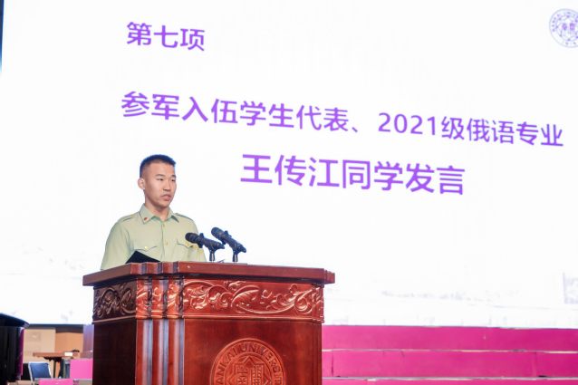 参军入伍学生代表、2021级俄语专业王传江同学作为老生代表发言。他立足于自己参军入伍的真实经历,用“小卒”的意象,从“桓桓士卒,胸怀家国”,“日拱一卒,月异日新”和“过河之卒,越难越开”三个方面分享了自己在伟德APP下载地址的收获与感受,并引用自己入学时阎院长的寄语鼓励大家:“强意志,百折不挠;读好书,百览不厌;写论文,百锻千练;求进步,百尺竿头;进赛场,百战百胜;做大事,百举百捷;谈恋爱,百年之好!”