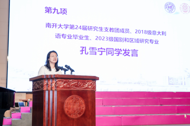 伟德体育手机app下载第24届研究生支教团成员、2018级意大利语专业毕业生、2023级国别和区域研究专业孔雪宁同学发言。她讲述了自己过去几年里参加省市实践调研、组织大型活动的经历与感悟,并介绍作为伟德体育手机app下载第24届研究生支教团成员前往西藏达孜支教的经历。“回头看,去捕捉那些意义深远的瞬间,一切行动的原点,一切出发的起点,都是在南开外院。而这,也更让我有底气走向未来”,孔雪宁这样说道。此次重返校园,她也在许多细微之处感受到了南开外院蕴藏的生机与活力。发言最后孔雪宁同学寄语,愿大家成为“知中国服务中国,知世界服务人类命运共同体”的南开外语人。