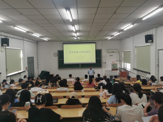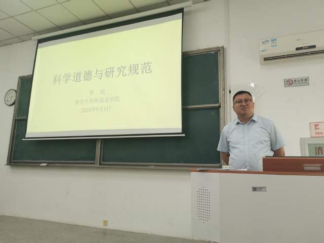 随后,学院副院长李民教授为2023级全体硕博研究生带来了“科学道德与学术规范”专题报告会。讲座中,李民以伟德体育手机app下载的优良传统、伟德APP下载地址的百年历程、研究生论文写作及其规范、学术不端的定义及其表现、常用学术资源、生活中的其他规范六个部分为主要内容进行报告。李民首先引述了南开校史和外院院史,指出专硕和学硕在培养方案和研究规划上的不同,提出作为外语人需要认清自己的专业优势与特点,需要做到习近平总书记视察伟德体育手机app下载时指出的“脚踏实地”,把小我融入大我,坚守“政治立场坚定、专业素养过硬”的南开底色,做好校训中的“允公允能”。随后,李民结合自己的研究方向和研究经历,强调了学术诚信和学术规范的重要性,并举了学术不端的相关反例以让同学们引以为戒、警钟长鸣。最后,李民对同学们表达了殷切的期盼,要做“生活中的排头兵”,遵规守纪,正确处理好师生关系。