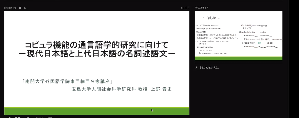 讲座首先从跨语言视角出发,概述了英语、法语、意大利语、阿拉伯语、俄语中的“名词+系词”结构,通过跨语言的考察,定义了“系词(copula)”的语法功能。此后,根据相关定义,对日语的名词谓语句做出了深入描写与分析。上野教授认为,日语的系词是「だ」的传统观点有待商榷,过去时态下,日语的系词可分析为「だった」、非过去时态下日语的系词可视作零形式(∅)。上野教授进一步从历时角度分析了该观点的可能性,并以《万叶集》为例,归纳了上古日语中名词句的三种类型,指出系词零形式(∅)的名词句频率最高。