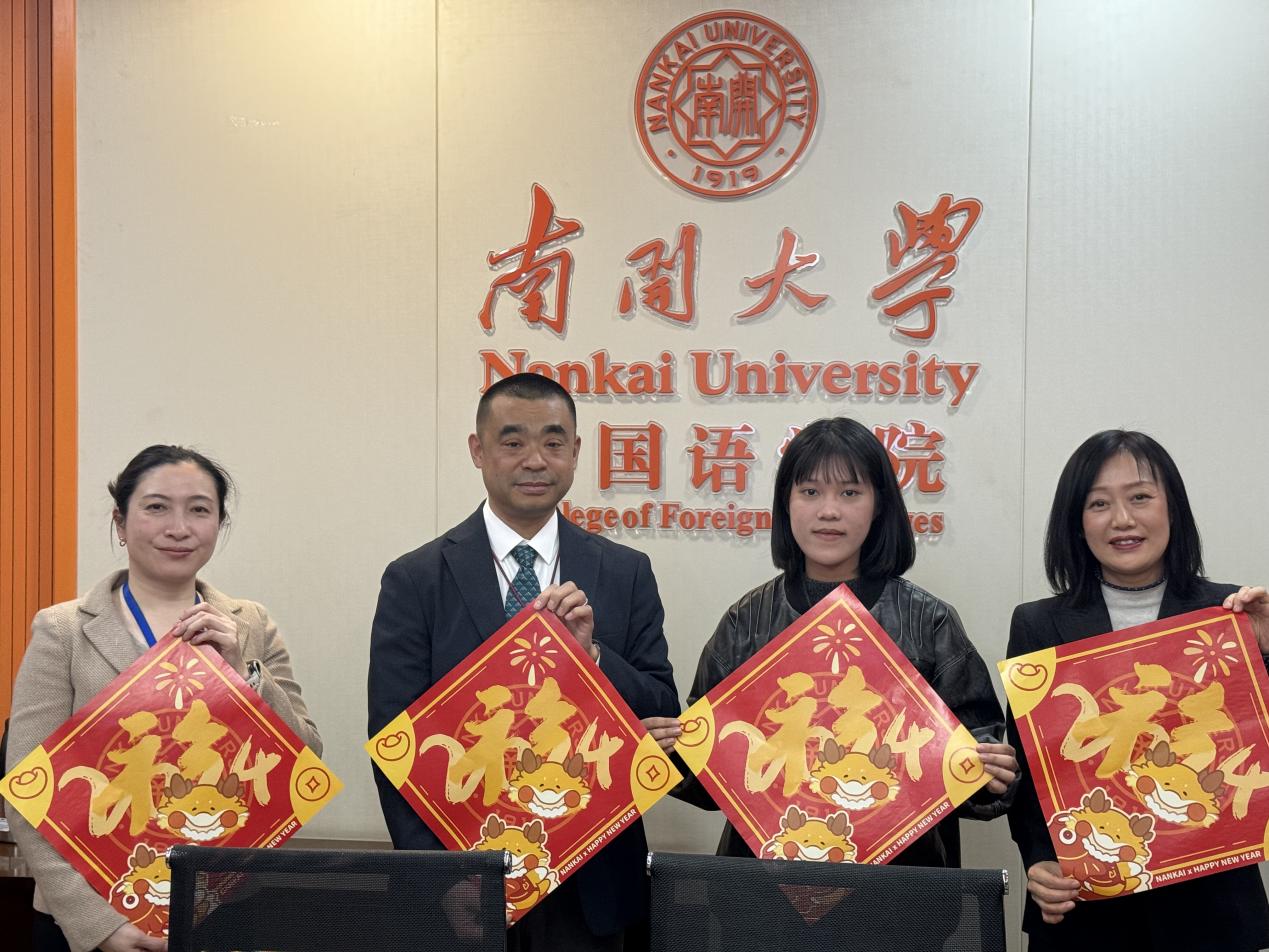 座谈会后,2020级阙梦萍同学代表日语系向客人赠送了自己设计的纪念礼品。