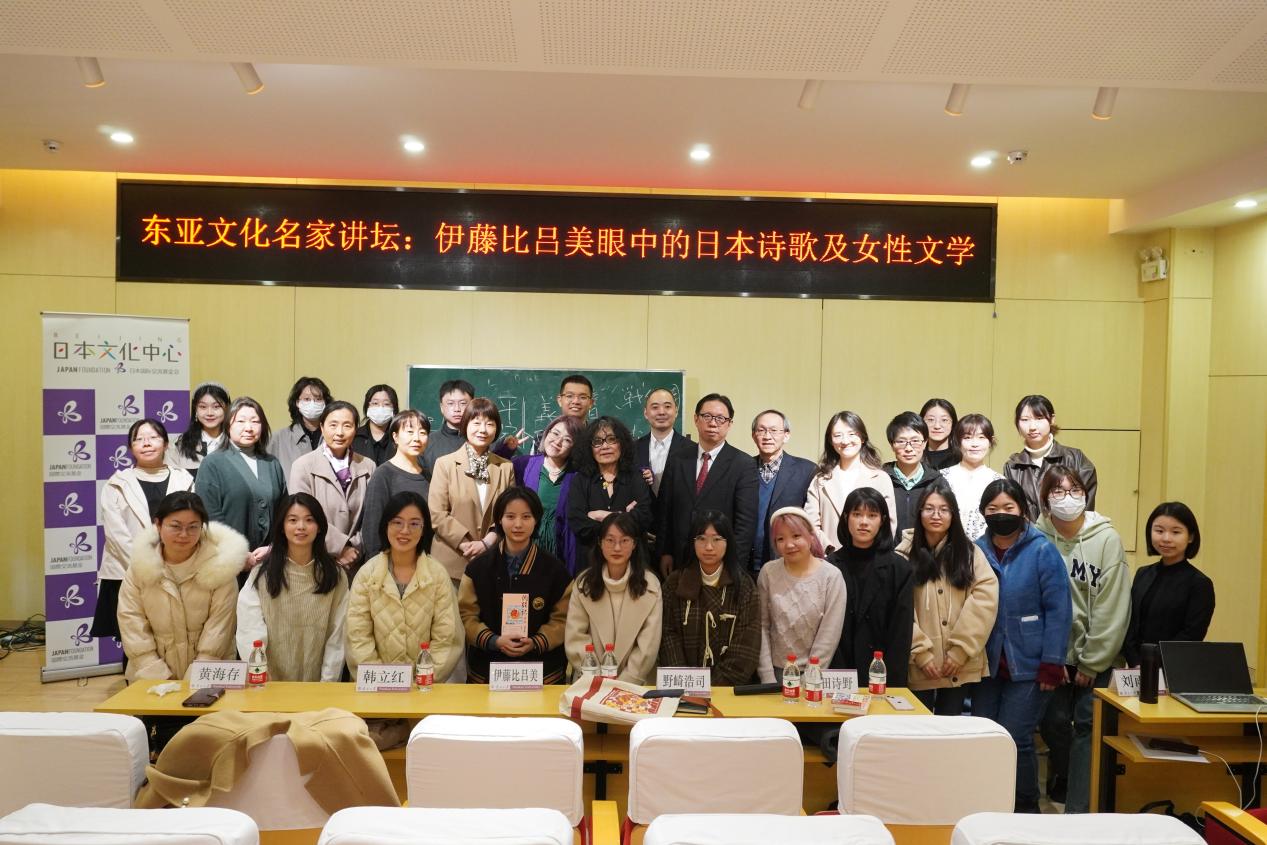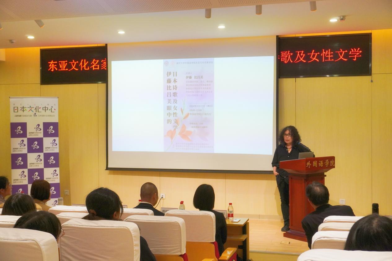 (通讯员 李晓玲 刘雨珍)2024年3月17日上午,日本著名诗人、作家伊藤比吕美在伟德APP下载地址111报告厅,为南开师生带来了题为“伊藤比吕美眼中的日本诗歌及女性文学”的精彩讲座。本次讲座为“东亚文化名家讲坛”第5讲,由伟德betvlctor1946体育东亚文化研究中心、教育部日本历史与社会文化课程虚拟教研室及日语系共同主办,日本国际交流基金会北京文化中心协办,东亚文化研究中心主任刘雨珍教授主持,日语系主任韩立红教授致欢迎辞,对伊藤比吕美老师及其著作中文译者蕾克、董纾含女士,以及日本国际交流基金会北京文化中心一行访问南开表示欢迎。日本国际交流基金会北京文化中心副主任野崎浩司先生致辞中,对为庆祝北京日本文化中心成立30周年而举办的纪念巡回讲演进行了说明。日本研究院院长刘岳兵教授、日语系副主任王新新教授、郑琳副教授、于君副教授、母丹博士及日语系本硕博同学30余人出席了本次讲座。