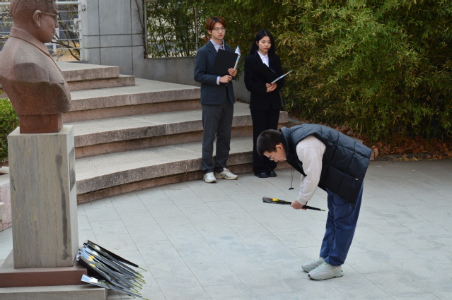 全体成员依次向穆旦雕像鞠躬并敬献鲜花,黄白相簇的花束表达了师生校友对穆旦先生深深的怀念与敬意。