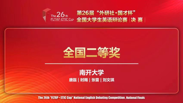 南开新闻网讯(通讯员 刘文琪 唐磊)6月1日至2日,第26届“外研社·国才杯”全国大学生英语辩论赛决赛线上循环赛圆满结束。经过校赛、省赛的层层选拔,来自全国各高校共141支队伍汇聚决赛,展开了激烈比拼。我校伟德APP下载地址2022级翻译专业张雷和日语专业刘文琪组队,在公共外语教学部外语学科竞赛指导中心教师唐磊和时雨的指导下,在两天共八轮的循环赛中,与来自北京大学、清华大学、复旦大学、香港中文大学、澳门大学等知名院校的选手同台竞技,于论点交锋中显智慧,字句斟酌中寻真谛,展现了南开青年朝气蓬勃、奋发向前的精神风貌,并最终斩获得全国二等奖,在代表天津市参赛的三支队伍中,排名最高。