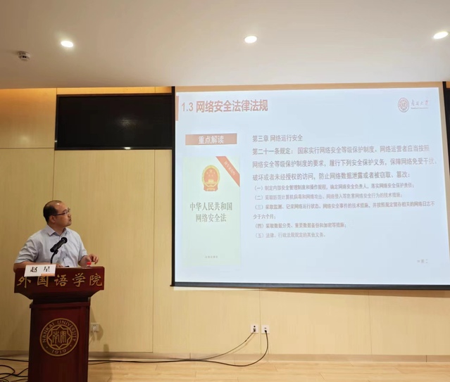 活动伊始,穆祥望先对活动进行了精炼的介绍,她强调了“网络不是法外之地”,学院一向对网络安全教育的高度重视,网络安全教育也是党纪学习教育中重要内容。随后赵星从“国家——学校——个人”三个主体层层递进开始讲座。
