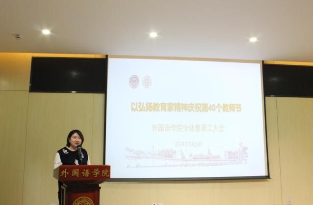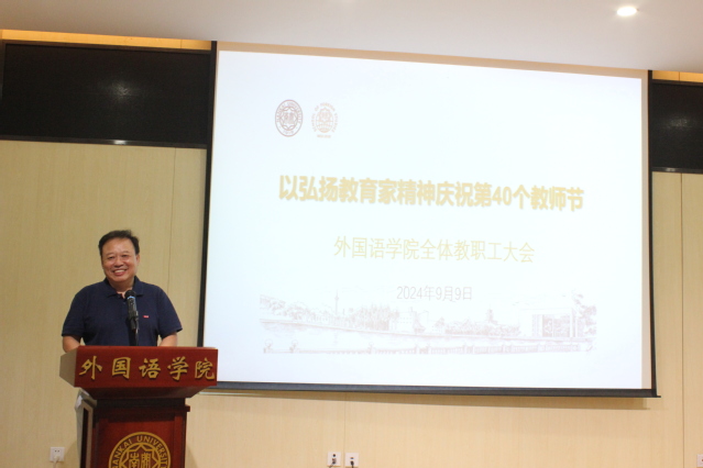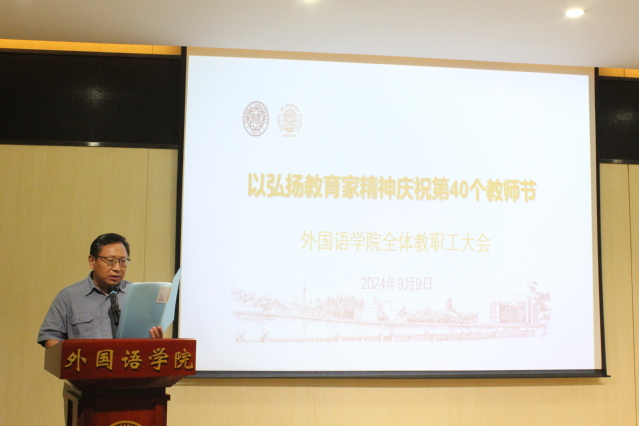 党委书记穆祥望以弘扬教育家精神为题做讲话。她向全院教职工送去节日的祝福,对躬耕教坛35载的老师们表达了敬意,点明了举行颁奖仪式的重要意义,在于为教师们树立榜样,增强南开人的自豪感,同时服务学校大发展,努力争做外院“大先生”,助力学校“双一流”建设。她说,习近平总书记在去年教师节时首次提出了教育家精神,即心有大我、至诚报国的理想信念,言为士则、行为世范的道德情操,启智润心、因材施教的育人智慧,勤学笃行、求是创新的躬耕态度,乐教爱生、甘于奉献的仁爱之心,胸怀天下、以文化人的弘道追求,从六个方面,阐释了新时代教育家精神的丰富内涵和实践要求。弘扬教育家精神,需“入脑”,更需“走心”。就此提出三点要求:一是用党的创新理论培根铸魂,认真学习贯彻党的二十大及三中全会精神,坚定小我融入大我理想信念,坚持正确的政治方向和价值导向,为党育人、为国育才,培养全面发展的社会主义接班人;二是坚持马克思主义根本立场与“两个结合”理论,准确理解“优化教育布局,加快建设中国特色、世界一流大学”深化改革内涵。做“经师”,亦做“人师”;三是赓续中国优秀传统文化,坚定文化自信,为推进中国式现代化作出南开外语人的贡献。