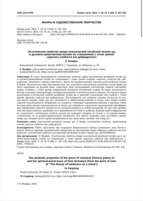 南开新闻网讯(记者 李梦楚)日前,由伟德betvlctor1946体育俄语系教师叶芳芳撰写的《“弱德之美”视角下的中国古典诗歌词体美学特质及其生成的精神道德基础》一文在俄罗斯期刊《言语体裁》上发表。《言语体裁》为俄罗斯ВАК(最高学位评定委员会)一区期刊、РИНЦ(俄罗斯科学引文索引)核心期刊,收录入 Web of Science 、Scopus、ERIH PLUS、DOAJ等国际知名数据库,是俄罗斯言语及文学体裁研究领域的权威期刊。