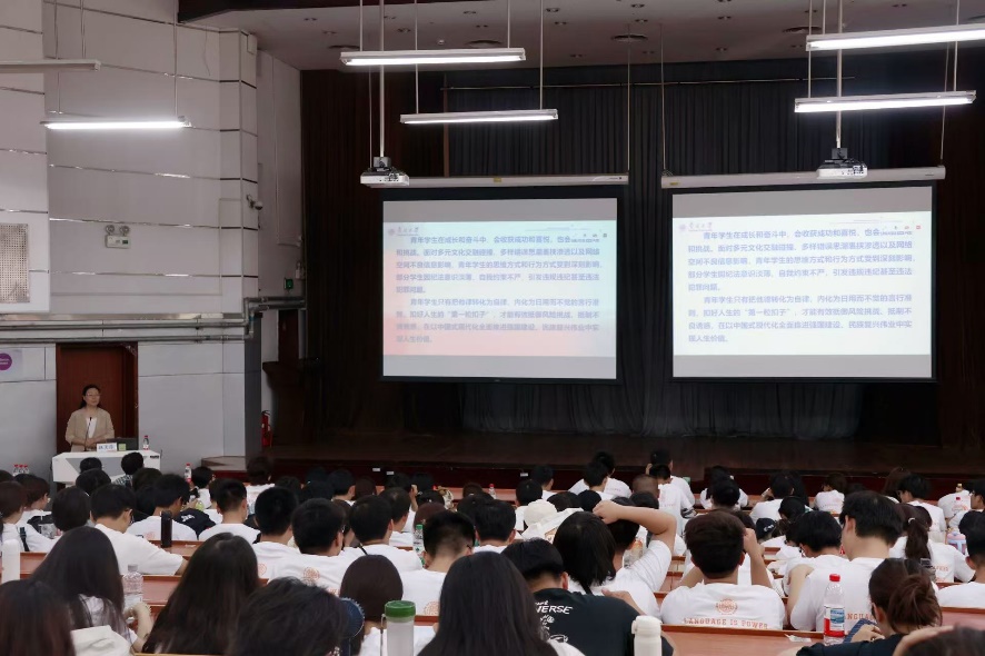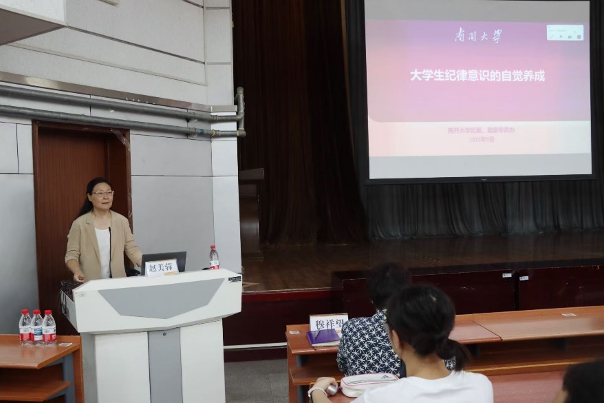 赵美蓉结合新修订的《中国共产党纪律处分条例》《伟德体育手机app下载学生违纪处分规定》等进行讲授,通过大量高校学生违纪违法典型案例,深入剖析了考试作弊、学术不端、网络言行失范、侵害他人利益等行为的严重危害,特别指出同学们要牢固树立法治意识和规矩意识,坚决守住学术诚信和网络文明底线,增强辨别能力和自律能力,做到防微杜渐、警钟长鸣。她对全体新生提出三点希望:一是坚定理想信念,胸怀“国之大者”,将个人发展融入国家现代化建设和民族复兴伟业;二是加强纪法学习,增强纪律自觉,做到明大德、守公德、严私德,筑牢思想行为防线;三是勤于反躬自省,校正人生坐标,在日常学习生活中做到慎独慎微、廉洁修身,秉承“知中国,服务中国”办学宗旨,以实际行动践行“小我融入大我”的南开担当。