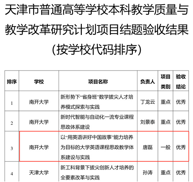 (通讯员 唐磊)近日,天津市教育委员会公布了天津市普通高等学校本科教学质量与教学改革研究计划项目结题验收结果。我院公共外语教学部(以下简称“公外教学部”)牵头开展的“以‘用英语讲好中国故事’能力培养为目标的大学英语课程思政教学体系建设与实践”项目,经学校初评、市级评审与专家答辩等多环节严格考核,最终获评“结项优秀”。